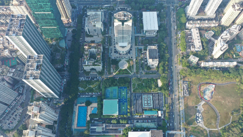 鸟瞰福田,点缀在楼宇屋顶上的光伏板与草木一起“呼吸吐纳”。