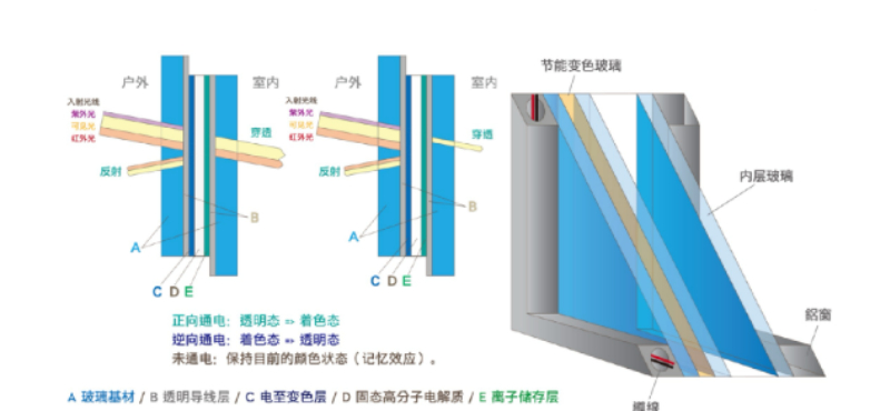 电致变色玻璃能减少外界热源及阳光热辐射进入室内,降低空调系统能耗,助力建筑物实现最佳采光与隔热平衡,符合国家“双碳”政策,应用前景广阔。