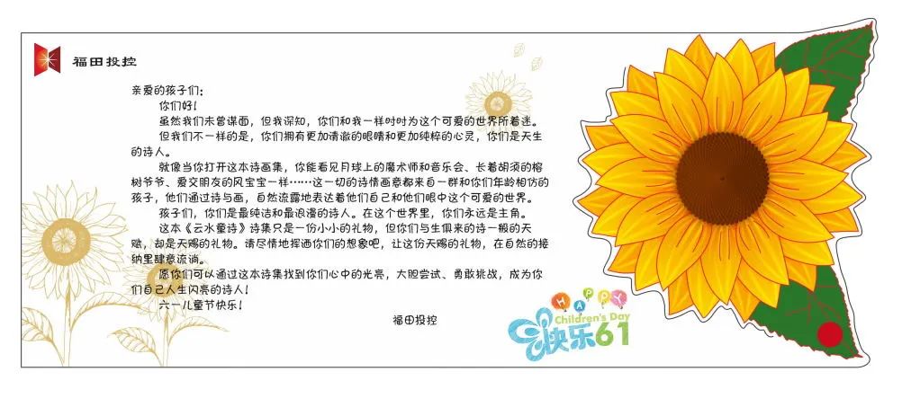孩子们惊喜的发现,best365足球彩票官网还在这本充满童趣的诗集中夹入了一封精致的小信笺,有向日葵花纹装饰过的信笺中,用一句句轻言软语鼓励着孩子们:“愿你们可以通过这本诗集找到你们心中的光亮,大胆尝试、勇敢挑战,成为你们自己人生闪亮的诗人!”