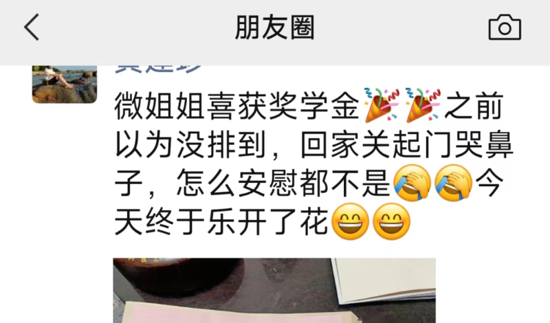 原本以为没进入获奖名单的黄奕微,最终还是从曾皓的手中领取了2023年度秋季优秀学生奖学金。从失落到兴奋,见证了黄奕微的心情变化,家人发出了这条“悲喜交加”的朋友圈。