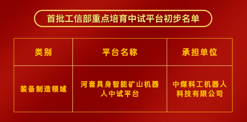 近日,工业和信息化部公示了首批重点培育中试平台的初步名单,全国共有242家中试平台入选,涵盖制造业高质量发展急需的领域,其中,机器人领域仅4家,中煤科工机器人科技有限公司建设的河套具身智能矿山机器人中试平台成功入选。