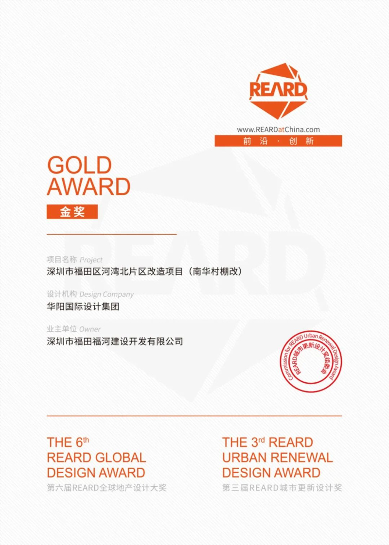 项目于2022年8月获得第六届REARD全球地产设计大奖、第三届REARD城市更新设计奖。REARD GLOBAL DESIGN AWARD (REARD全球地产设计大奖)由REARD中国地产设计网创立,致力于“寻找中国好设计,发现设计真灵魂”,以专业的视角、包容的姿态,迅速成为寻找中国优秀设计的耀眼之星。多年来,该大奖不仅植根于住宅、商业等地产领域,更不断开拓城市更新、产业、文旅、文化等新领域,堪称“走向世界的前沿类地产设计大奖”,这也是地产界首个设立“城市更新”类别的设计类大奖。