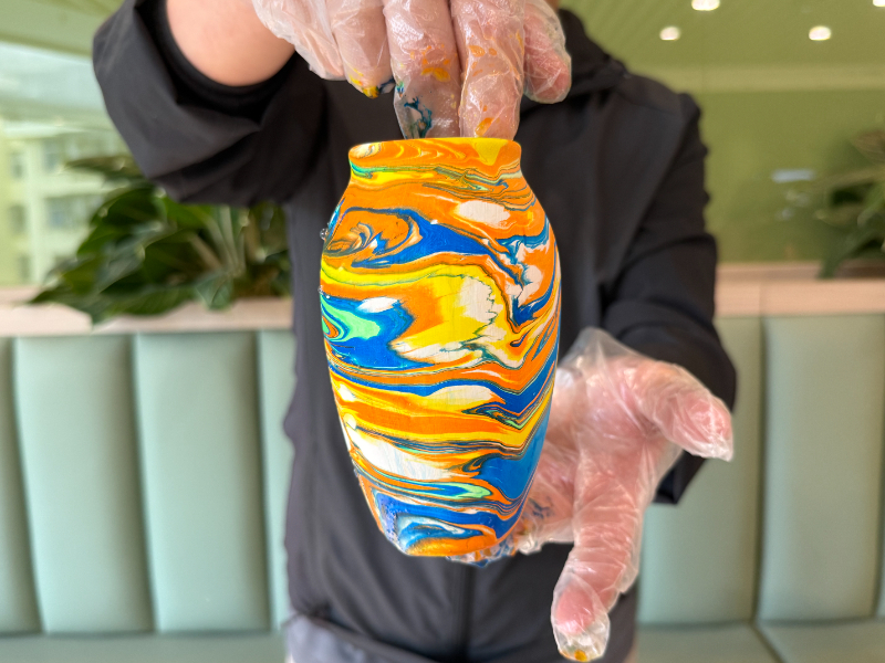 活动现场,大家尽情发挥想象,选择颜料滴入水中,再用工具拨弄成绚烂多彩的纹样。随后,将提前烧制好的花瓶浸入水中并捞出,一个个独具特色的水拓花瓶就诞生了。