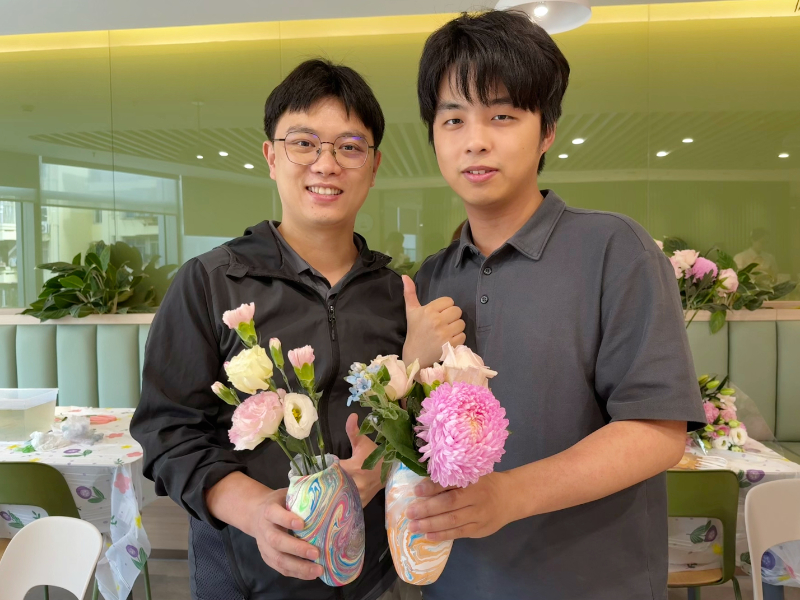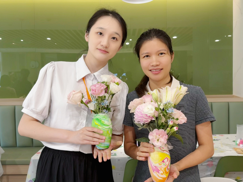 大家在老师的悉心指导下,挑选心仪的花材进行修剪、搭配,用百合、洋桔梗、牡丹菊等装点水拓花瓶,创作出属于自己的“花样”小世界。