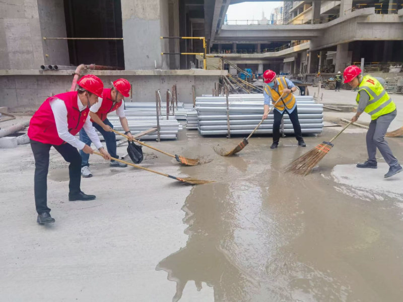 活动现场,党员志愿者对施工道路附近、基坑周边、材料堆放区等容易积水的关键区域,进行全面清扫。