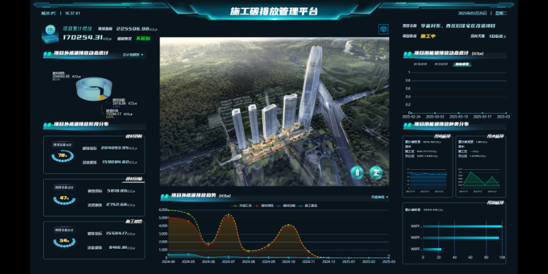 碳排放管理平台:平台围绕资源节约、能效提升、能源代替、资源循环四大抓手,在建造阶段,实现碳排数据的自动录入收集及分析,让项目建设团队清晰掌握建材消耗、运输以及施工现场的能源消耗等各个环节的实时碳排放情况,最终实现建造阶段碳排放降低20%的目标。