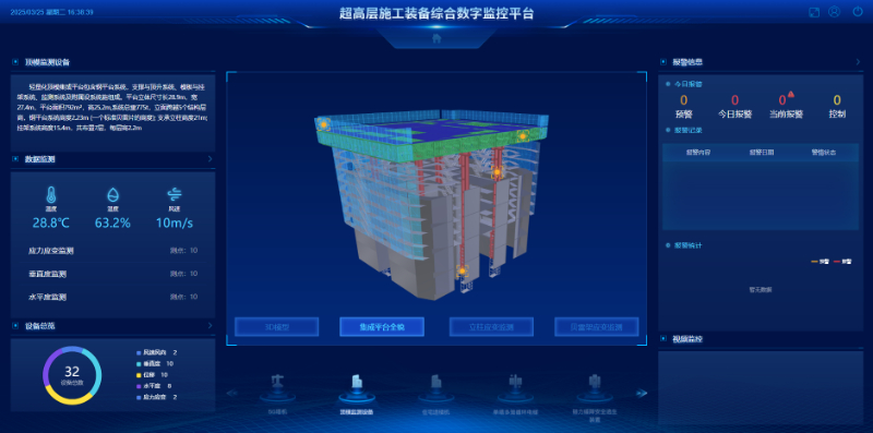 超高层数字装备集成平台平台运用联动5G互联技术实现智能安全帽、5G远程控制塔机、单塔多笼循环电梯、顶模监测、住宅造楼机监测等关键核心装备的数据集成分析展示及监控,改变传统施工方法,确保超高层施工过程安全与稳定,显著提升项目的品质。